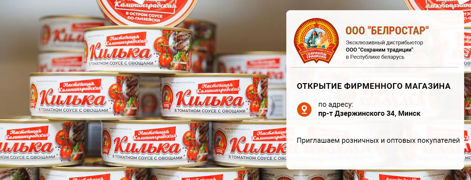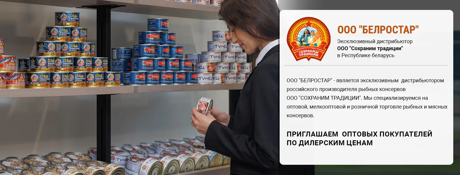 ООО «БЕЛРОСТАР» является официальным дистрибьютором российского производителя рыбных консервов ООО «СОХРАНИМ ТРАДИЦИИ». Компания специализируется на оптовой, мелкооптовой и розничной торговле качественных рыбных и мясных консервов. Прямые поставки от производителя гарантируют подлинность продукции, конкурентные цены и стабильное наличие всего ассортимента в наличии.